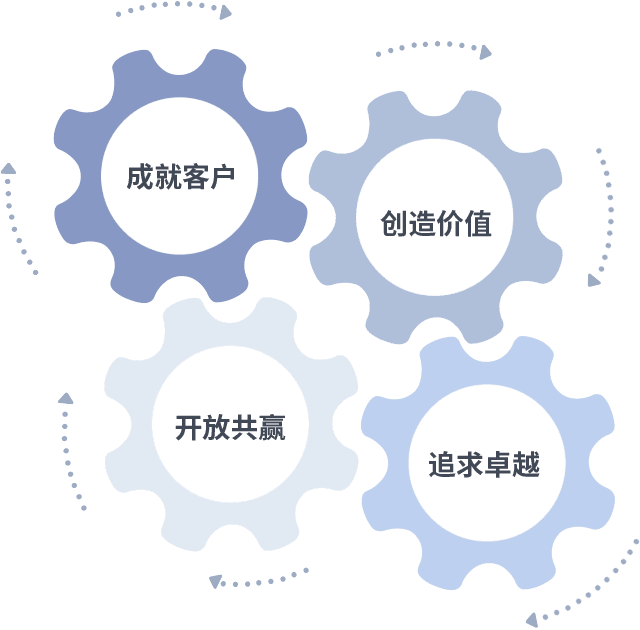 成就客户是一切决策的出发点,,创造价值是衡量所有工作的标准,,,,追求卓越是我们做事做人的态度,,,开放共赢是我们的格局也是最终的结果。。价值观的齿轮环环相扣,,,推动着组织里的每个人不断向前。。。