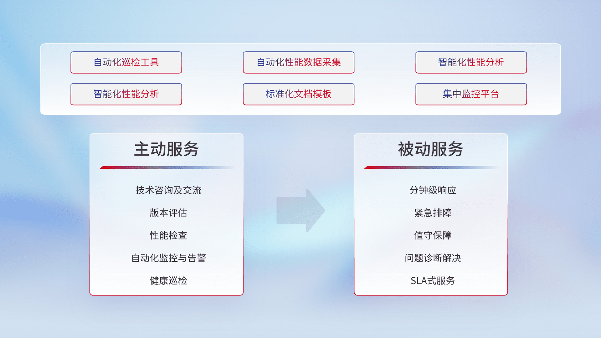 智能化工具和标准化文档,,,,保障服务质量,,提供主动服务(包含技术咨询、、版本评估、、、、性能检查、、、自动化监控与告警、、、、健康巡检)和被动服务包含(分钟级响应、、、紧急排障、、、、值守保障、、问题诊断解决、、、、SLA服务)。。